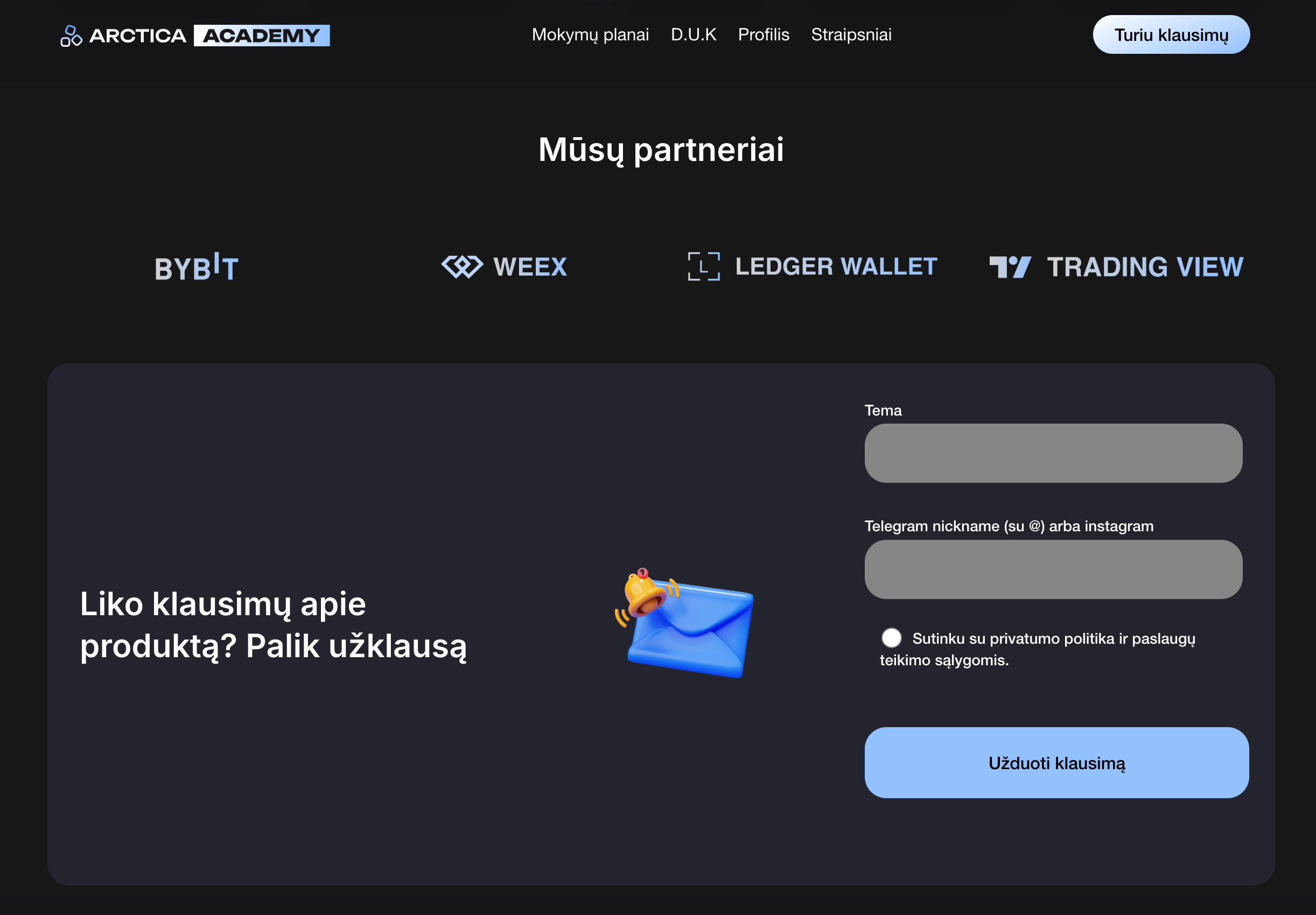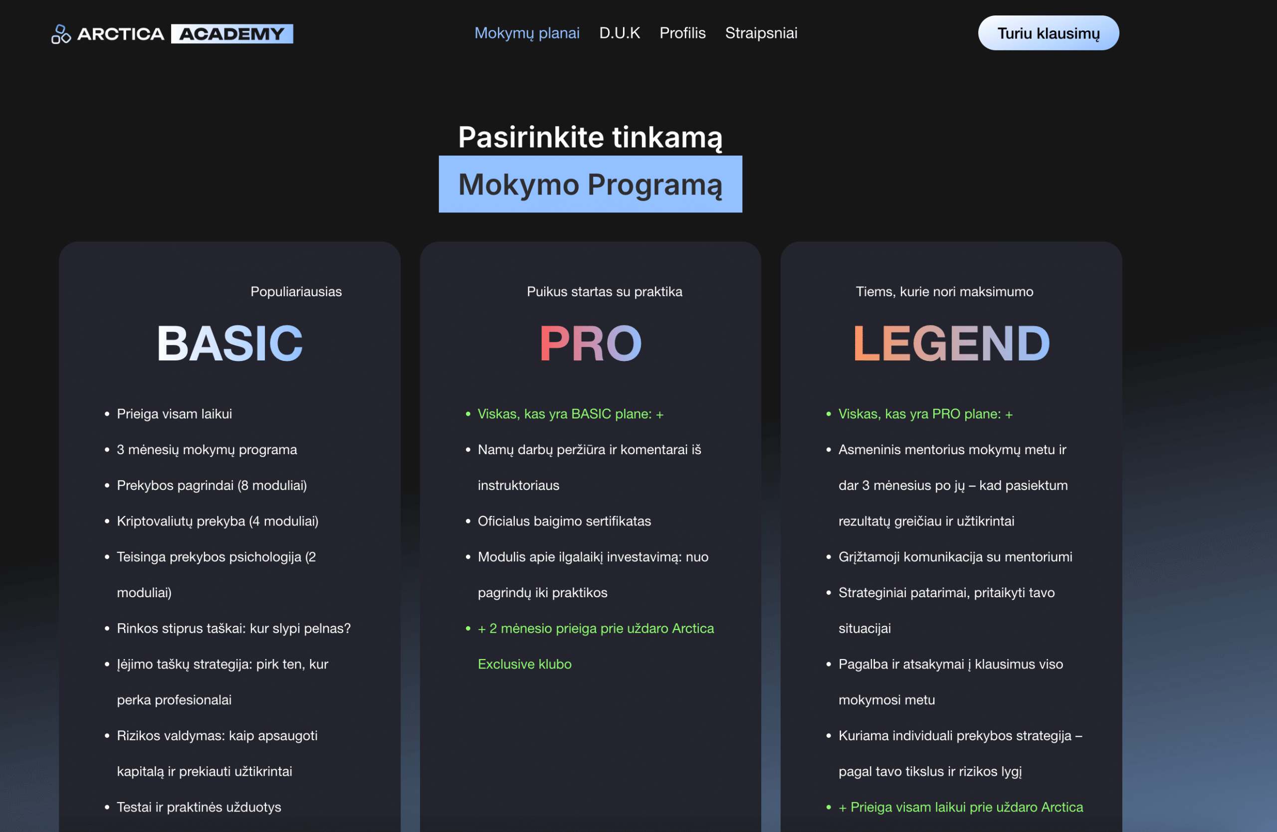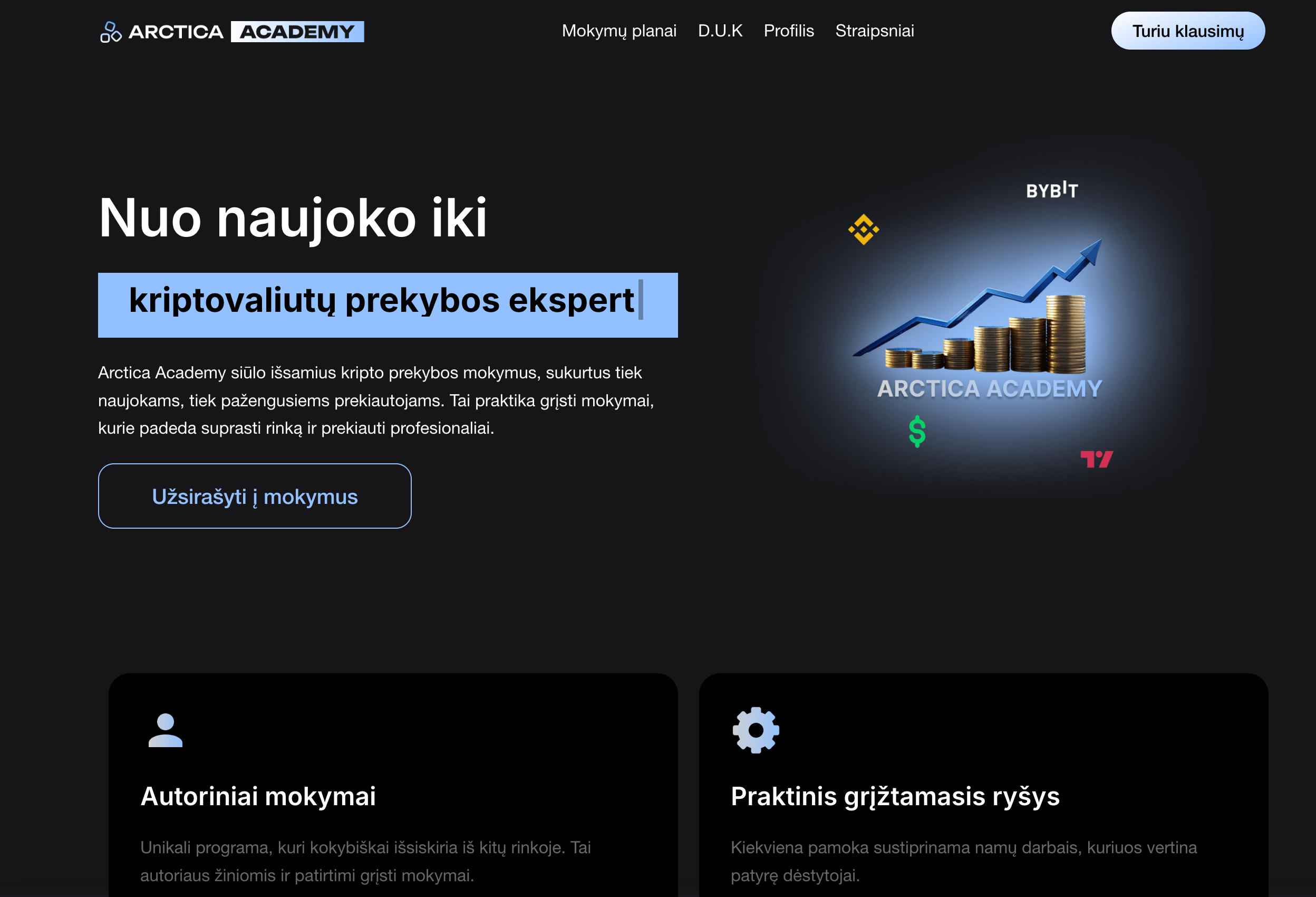 Arctica Academy siūlo išsamius kripto prekybos mokymus, sukurtus tiek naujokams, tiek pažengusiems prekiautojams. Tai praktika grįsti mokymai, kurie padeda suprasti rinką ir prekiauti profesionaliai.